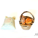 Pack de saco de harina y cesta con pan, para decorar junto a un panadero o similar.